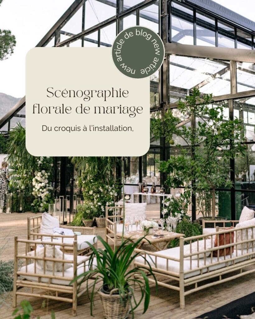 Créer une scénographie florale de mariage, ce n’est pas simplement imaginer de belles compositions florales. C’est pour moi concevoir un univers, une atmosphère, une intention. C’est penser l’espace comme une page blanche où chaque fleur, chaque matière, chaque ligne et chaque volume participent à une narration visuelle cohérente. Comme dans un projet artistique ou un décor de cinéma, tout commence bien avant le jour J : dans l’imaginaire, dans les esquisses, dans la construction d’un langage esthétique.